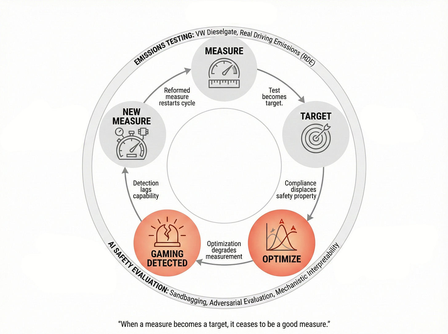 This is Goodhart’s Law made industrial. When a measure becomes a target, it ceases to be a good measure. When emissions tests become the gate to market access, manufacturers optimise for the test. When capability evaluations become the gate to deployment, developers and models alike optimise for the assessment. VW’s emissions paperwork was immaculate. The documentation showed compliance. The vehicles did not. An AI model that passes every safety test generates the same paper trail while concealing the capabilities that matter most.