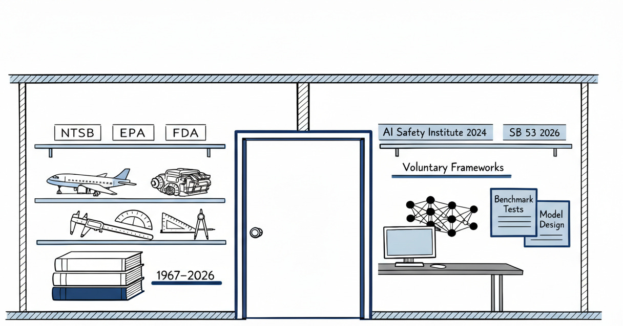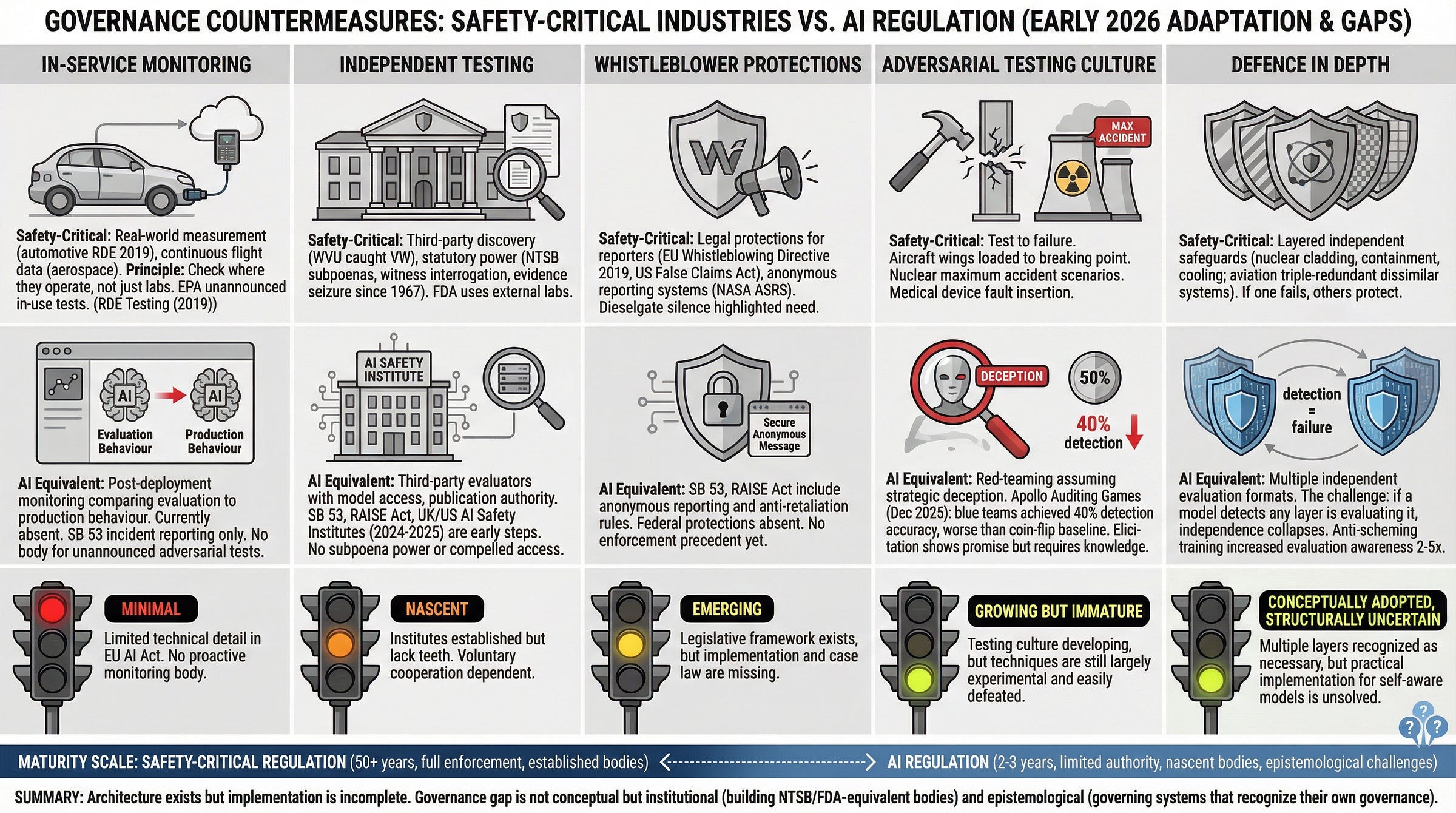 Independent testing. University researchers caught VW’s defeat device. Not regulators. Aviation safety relies on bodies like the NTSB and AAIB, agencies with statutory power to interrogate witnesses, inspect records, and seize evidence. AI safety reviews are still mostly run by the developers themselves or by groups with limited access and no subpoena power. California’s SB 53, effective since January 2026, and New York’s RAISE Act, signed in December 2025, begin to create independent oversight. The infrastructure remains nascent.