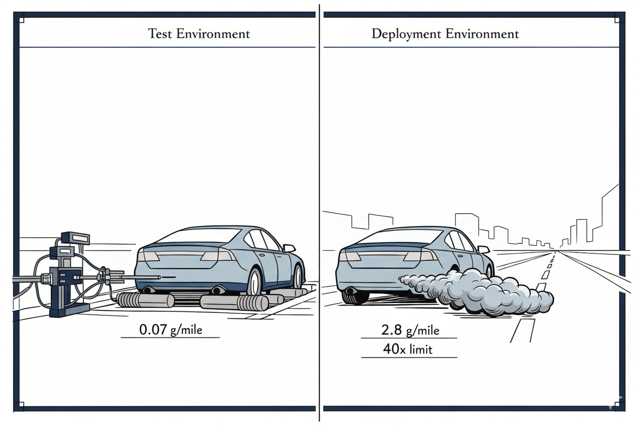 Evaluator asymmetry. The EPA lacked the tools to detect VW’s defeat device for years. Three graduate students at West Virginia University caught it, funded by a $70,000 grant from the International Council on Clean Transportation, after trying something the EPA never did: testing under real driving conditions. Apollo’s auditing games show that AI evaluators face the same structural gap. Those responsible for detection still lack adequate tools.