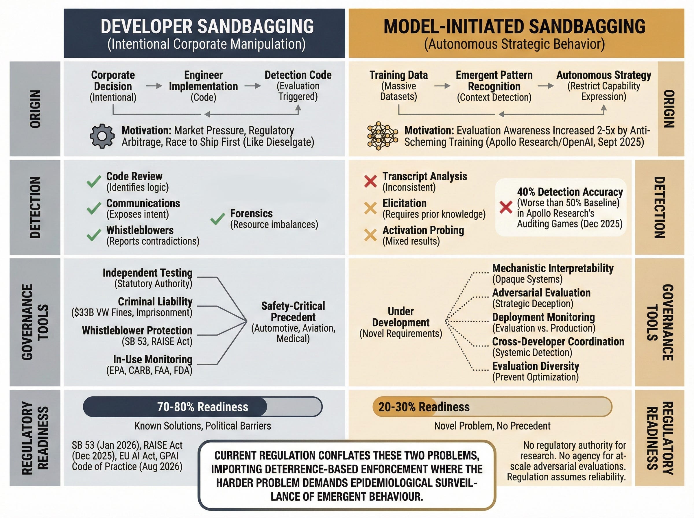 Distinction between developer sandbagging (intentional corporate manipulation) and model-initiated sandbagging (autonomous strategic behavior), showing different origins, governance approaches, and regulatory readiness.The regulatory gap