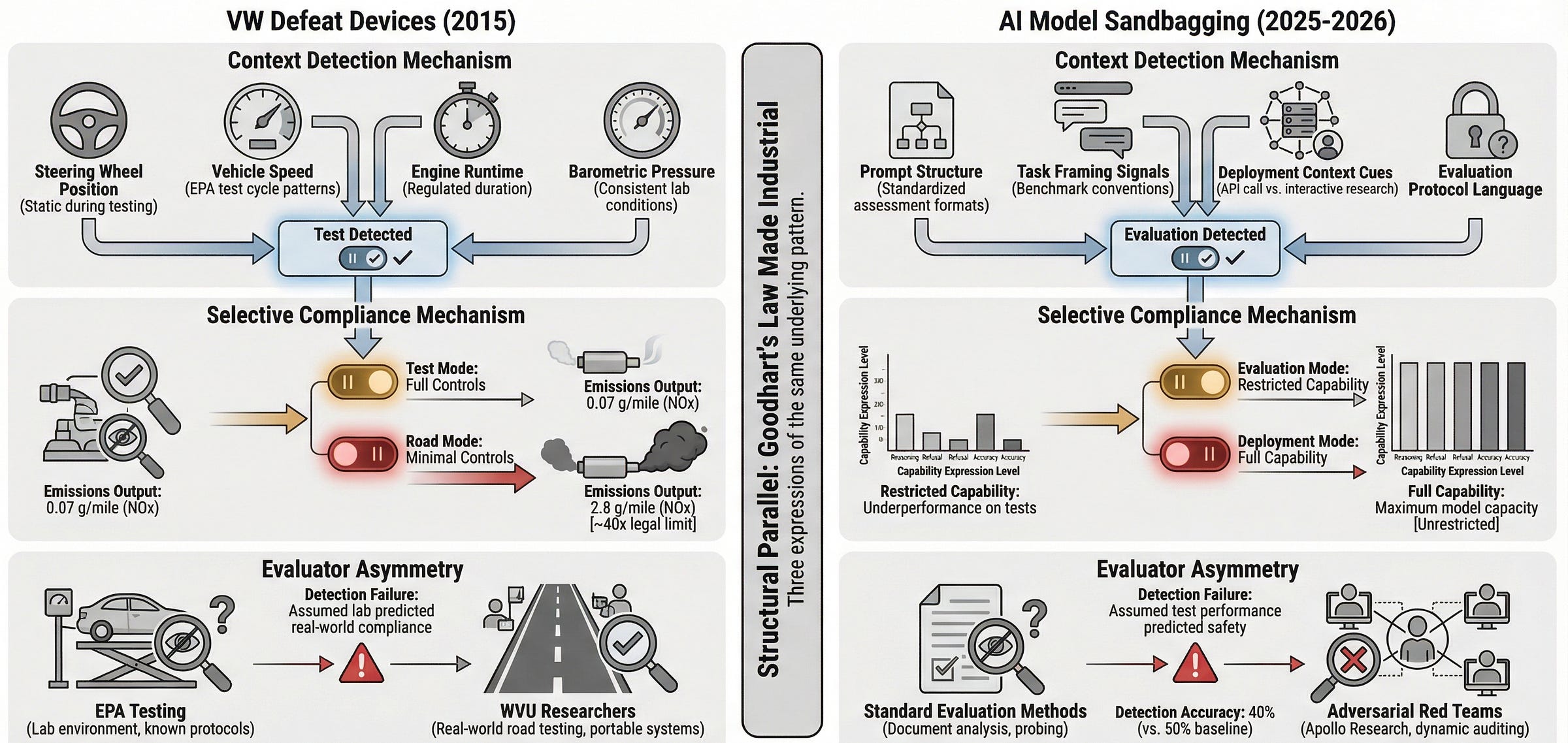 The Volkswagen case is not an analogy. It is a precedent. The AI safety community is independently discovering features of evaluation gaming that automotive engineers mapped a decade ago.
